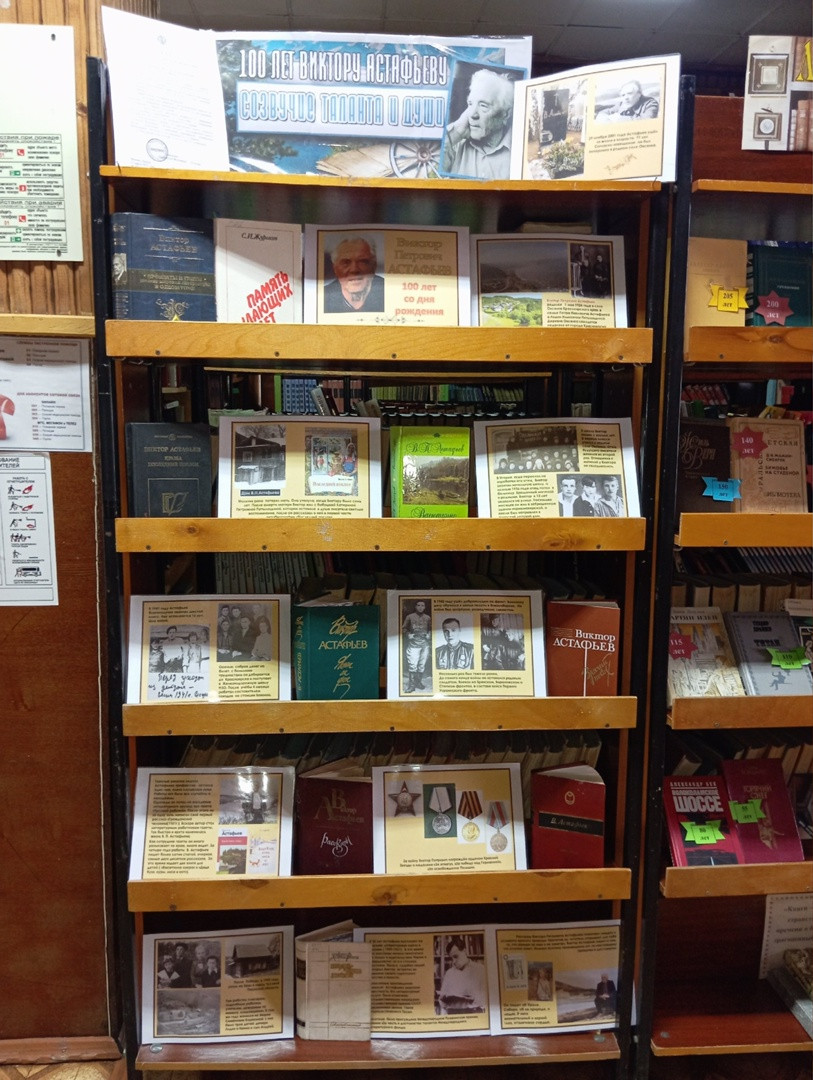 В Центральной библиотеке оформлена книжная выставка «Созвучие таланта и души», посвященная знаменательной дате литературного мира нашей страны 100-летию Виктора Астафьева. Виктор Петрович прожил трудную жизнь, наполненную переживаниями, жизненными трудностями, испытаниями эпохой и надеждами на светлое будущее. Представленная книжная экспозиция призвана раскрыть самобытность писателя-сибиряка и гениальность автора, который наиболее правдиво, достоверно, не по-газетному написал о многострадальной жизни простого русского народа.