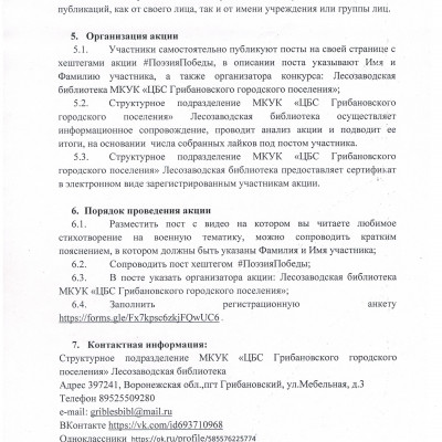 опубликовать пост на своей странице с хештегами акции #ПоэзияПобеды, в описании поста указать Имя и Фамилию участника, а также организатора конкурса: Лесозаводская библиотека МКУК «ЦБС Грибановского городского поселения».