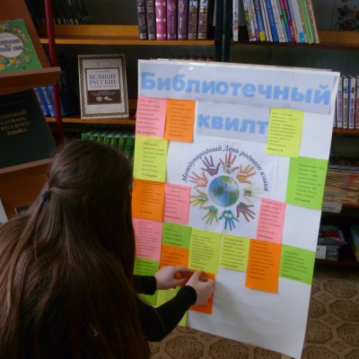 К Международному дню родного языка в детской библиотеке, 21 февраля, был оформлен библиотечный квилт «О русском языке замолвите словечко...». Ребята познакомились с высказываниями великих людей о русском языке, в том числе зарубежных писателей и ученых. Изюминка этой задумки состоит в том, что наши читатели сами искали по всей библиотеке спрятанные высказывания (напечатанные на небольших листочках) читали их вслух, называли автора и торжественно приклеивали к плакату. То есть они стали активными участниками в оформлении библиотечного квилта.